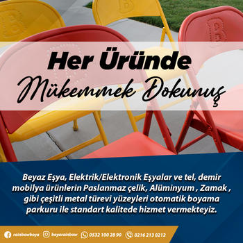 Ümraniye Esenşehir'de bulunan boyahanemizde; metal, plastik ve ahşap tüm ürünler boyanmaktadır. 1000 m2 kapalı alan, 10 personel ve boyama makinemiz ile sektörde 4. yılımızdayız. Talepleriniz doğrultusunda uygun fiyat ve kaliteli hizmet sunuyoruz.