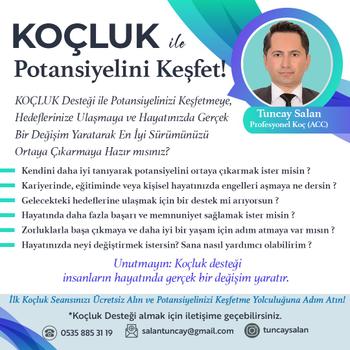 KOÇLUK ile POTANSİYELİNİ KEŞFET Uluslararası Koçluk Federasyonu (ICF) onaylı ACC (Associate Certified Coach) unvanına sahip profesyonel bir koç olarak, potansiyelinizi ortaya çıkarmaya, hedeflerinize ulaşmaya ve hayatınızda gerçek bir değişim yaratarak en iyi sürümünüzü yaşamaya hazır mısınız? Koçluk ile Neler Kazanabilirsiniz? Kendini daha iyi tanıyıp güçlü yönlerini ortaya çıkarmak Kariyerinde, eğitiminde veya özel hayatında engelleri aşmak Gelecekteki hedeflerine emin adımlarla yürümek Daha fazla başarı, motivasyon ve memnuniyet sağlamak Zorluklarla başa çıkma becerisini geliştirmek Hayatında değiştirmek istediğin konularda profesyonel destek almak Unutmayın: Koçluk, insanların hayatında gerçek ve kalıcı değişim yaratır. Öğrenci Koçluğu Desteği Aynı zamanda öğrenci koçluğunda deneyimliyim. Öğrencilerin güçlü yönlerini keşfetmelerine, Hedeflerini netleştirmelerine, Disiplinli ve verimli bir çalışma sistemi kurmalarına destek oluyorum. Koçluk sürecinde motivasyonlarını artırmalarına, sınav kaygısını yönetmelerine ve özgüvenle ilerlemelerine odaklanıyorum. Nasıl Çalışıyoruz? Size uygun gün ve saatlerde online görüşme imkânı İlk tanışma seansı ÜCRETSİZ Bireysel ihtiyaçlarınıza göre kişisel gelişim planı ICF onaylı ACC unvanlı profesyonel koç ile hayatınızda değişim için ilk adımı atın. İlk koçluk seansınızı ücretsiz alın ve potansiyelinizi keşfetmeye başlayın!