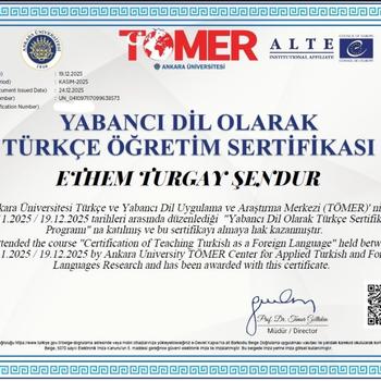 YABANCI DİL OLARAK TÜRKÇE ÖĞRETİMİ SERTİFİKASI Ankara Üniversitesi Türkçe ve Yabancı Dil Uygulama ve Araştırma Merkezi (TÖMER)'nin 24.11.2025 – 19.12.2025 tarihleri arasında düzenlediği "Yabancı Dil Olarak Türkçe Öğretimi Sertifika Programı"na katılmış ve bu sertifikayı almaya hak kazanmıştır. Attended the course "Certification of Teaching Turkish as a Foreign Language" held between 24.11.2025 – 19.12.2025 by Ankara University TÖMER Center for Applied Turkish and Foreign Languages Research and has been awarded this certificate.