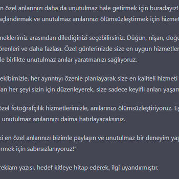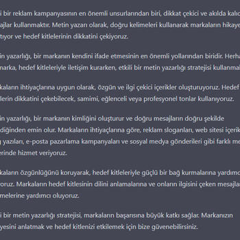 Fazlasıyla profesyonel bir şekilde metin, hikaye, tanıtım yazısı, slogan, reklam yazıları yazabilirim. Beğenmediğiniz takdirde değiştirme imkanı sunarım ve sizin için özelleştirilmiş yazılarla aradığınız şeyi bende bulmanızda yardımcı olurum.