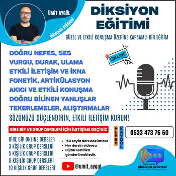 Diksiyona dair tüm konular ayrıntılarıyla interaktif olarak her katılımcıya egzersizler yaptırılarak ve tekelerlemeler okutularak yapılmaktadır.