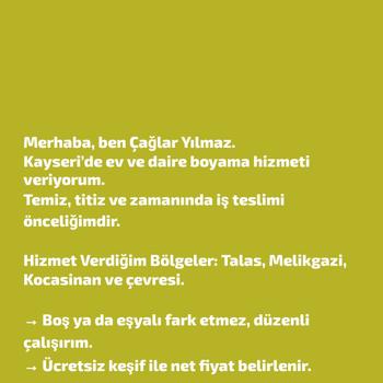 Merhaba, ben Ümit Çağlar. Kayseri’de ev ve daire boyama hizmeti veriyorum. Temiz, titiz ve zamanında iş teslimi benim için ön plandadır