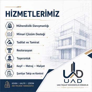 UAD İnşaat Mühendislik Mimarlık olarak tadilat, uygulama, keşif-metraj, maliyet analizi ve şantiye takip hizmetleri sunuyoruz. Projeden uygulamaya kadar planlı, kontrollü ve çözüm odaklı şekilde çalışıyoruz. Konut, iş yeri ve çeşitli yapı işlerinizde profesyonel destek için iletişime geçebilirsiniz.