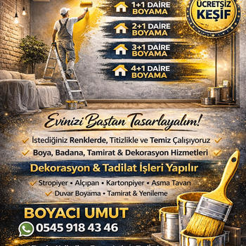 Merhaba, boya ve badana alanında uzun süredir profesyonel olarak hizmet vermekteyim. Daire, ofis ve iş yerlerinizde iç cephe boya, badana, alçı tamiri, duvar düzeltme ve küçük tadilat işlerini temiz ve titiz bir şekilde yapıyorum. İşe başlamadan önce eşyalarınızı ve zeminleri koruma altına alır, iş bitiminde ortamı temiz bir şekilde teslim ederim. Kaliteli boya ve malzeme kullanarak uzun ömürlü ve düzgün bir sonuç elde edilmesini sağlıyorum. Müşteri memnuniyeti benim için en önemli konudur. Zamanında teslim, temiz işçilik ve uygun fiyat prensibiyle çalışıyorum. Ücretsiz keşif için iletişime geçebilirsiniz.