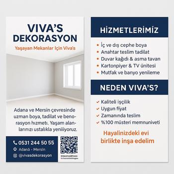 yaşamınızın en özel alanı Zamanla yıpranan duvarlar, eskimiş detaylar ve ihtiyaçlarınıza cevap vermeyen yaşam alanları sizi yormasın! Viva’s Dekorasyon olarak Adana, Mersin ve çevre ilçelerde sunduğumuz profesyonel boya ve tadilat hizmetleriyle evinizi hayal ettiğiniz mekâna dönüştürüyoruz. Her projeye özgü çözüm üretiyor, kaliteli malzeme ve ustalıkla yüzde yüz müşteri memnuniyeti sağlıyoruz. Renk uyumundan detaylara kadar her adımda profesyonel dokunuşlarla yanınızdayız