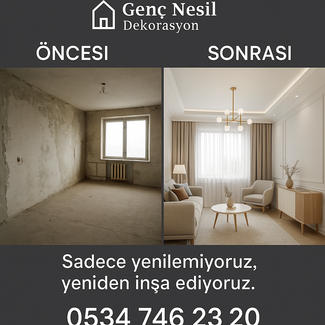 Genç Nesil Dekorasyon ve tasarım olarak müşterilerimize en güzel ve kaliteli hizmet vermek için gayret ediyoruz. Her türlü iç mimar hizmeti dekorasyon ve tadilat anahtar teslim daire , işyeri, ofis, dükkan ve villa en kaliteli ekipmanlarla teslim edilir bir telefon kadar yakınız İstanbul için ve dışı hizmet vermekteyiz.tadilat işleriniz en kısa sürede kaliteli bir şekilde teslimat yapılır.