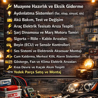 Akü değişimi (yerinde) • Akü takviye • Tesisat arıza tespiti • Sigorta / röle arızaları • Aydınlatma sistemleri • Muayene öncesi elektrik kontrolü Marş dinamosu revizyonu • Şarj dinamosu (alternatör) revizyonu • Kömür (fırça) değişimi • Konjektör değişimi • Rulman değişimi • Sargı kontrolü • Voltaj düşümü / şarj kesme arızası • Yerinde sök-tak + atölyede revizyon