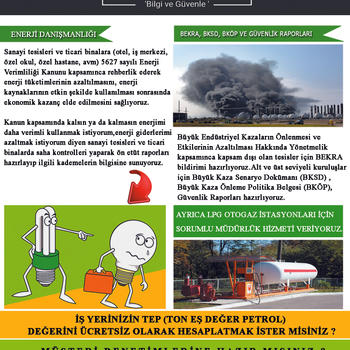 Sayın Yetkili, Çevre, İş Sağlığı ve İş Güvenliği ile Enerji Yönetimi alanlarında sahip olduğumuz bilgiyi ve 11 yıllık saha tecrübelerimizi Özcan Çevre ve Enerji Mühendislik Danışmanlık San. ve Tic. Ltd. Şti. çatısı altında 2023 yılıyla birlikte ihtiyaç duyduğunuz anlarda sizlerle paylaşmak isteriz. Firma olarak sunmuş olduğumuz hizmetlerden bazıları aşağıda mevcuttur; • Çevre Kanunu ışığında işletme sahaları incelenerek uygunsuzlukların tespit edilmesi ve iyileştirilmesi konusunda gerekli raporlamanın yapılması. • Çevresel konularda kamu ve müşteri (inditex, elevete, vb) denetimlerine hazırlık ve iyileştirme süreçlerine rehberlik edilmesi. • Kentsel ve endüstriyel nitelikli atıksuların arıtılması ve alıcı ortama verilmesine kadarki süreçte danışmanlık hizmeti verilmesi. • İşyeri Açma ve Çalışma Ruhsatların alınması ya da mevcut ruhsatların revize edilmesi süreçlerinin yürütülmesi. • İş Sağlığı ve Güvenliği Kanunu ışığında işletme sahaları incelenerek uygunsuzlukların tespit edilmesi ve iyileştirilmesi konusunda gerekli raporlamanın yapılması. • İSG konularda kamu ve müşteri (inditex, elevet, vb) denetimlerine hazırlık ve iyileştirme süreçlerine rehberlik edilmesi. • Patlamadan korunma dokümanı hazırlanması. • Enerji Verimliliği Kanunu kapsamında işletmelerin sahaları incelenerek enerji maliyetlerinin azaltılması adına ön etüt raporlarının hazırlanması. • Lpg Otogaz istasyonlarına sorumlu müdürlük kapsamında danışmanlık hizmeti verilmesi Talep etmeniz halinde firmanıza ziyaret gerçekleştirerek faaliyet konuları ve sormak istediğiniz hususlar hakkında ayrıntılı bilgilendirme yapabileceğimizi belirtir, İyi Çalışmalar Dileriz