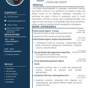 Merhaba! Ben Yusuf, ileri düzeyde İngilizce bilgim ve dilcilik alanındaki akademik geçmişimle sizlere özel İngilizce dersleri sunuyorum. Eskişehir Osmangazi Üniversitesi Karşılaştırmalı Edebiyat bölümü son sınıf öğrencisiyim. İngilizce ve Fransızca olmak üzere iki yabancı dile hâkimim ve freelance çevirmenlik, müşteri temsilciliği gibi deneyimlere sahibim. Sunduğum hizmetler arasında İngilizce dil bilgisi, kelime hazinesi ve konuşma pratiği; iş İngilizcesi ve akademik İngilizce destek programları; okuma, dinleme ve yazma becerilerinizi geliştirmeye yönelik ders içerikleri bulunmaktadır. Neden beni tercih etmelisiniz? Eğitim yaklaşımım tamamen sizin ihtiyaçlarınıza özeldir. Akademik bir altyapı ve deneyimle etkili bir öğrenim süreci sunarım. Sabırlı, güler yüzlü ve motive edici bir öğretmenim. Daha fazla bilgi almak için benimle iletişime geçebilir ve öğrenim hedeflerinize ulaşmak için ilk adımı atabilirsiniz!
