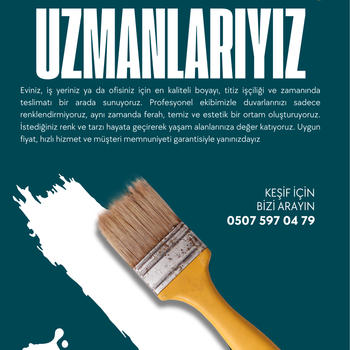 Eviniz, iş yeriniz ya da ofisiniz için en kaliteli boyayı, titiz işçiliği ve zamanında teslimatı bir arada sunuyoruz. Profesyonel ekibimizle duvarlarınızı sadece renklendirmiyoruz, aynı zamanda ferah, temiz ve estetik bir ortam oluşturuyoruz. İstediğiniz renk ve tarzı hayata geçirerek yaşam alanlarınıza değer katıyoruz. Uygun fiyat, hızlı hizmet ve müşteri memnuniyeti garantisiyle yanınızdayız.