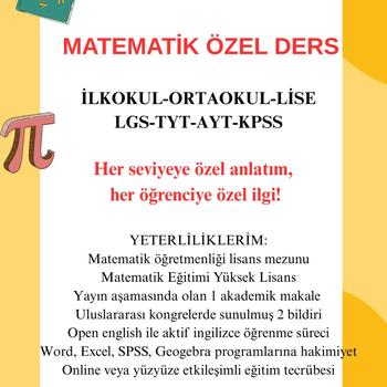 Matematik eğitimi Yüksek lisans 5 yıllık özel ders tecrübesi Yayın aşamasında 1 akademik makale Uluslararası kongrelerde sunulmuş 2 bildiri Open english ile aktif İngilizce öğrenme süreci Online veya yüzyüze etkileşimli eğitimi tecrübesi Word,Excel, Spss,Geogebra programlarına hakimiyet