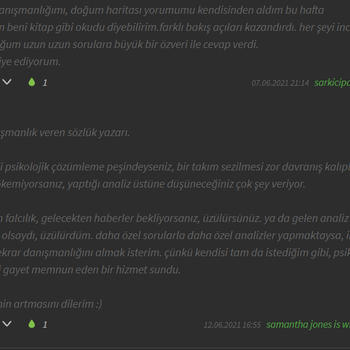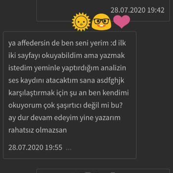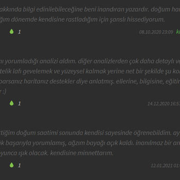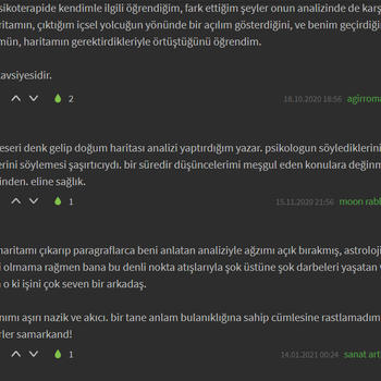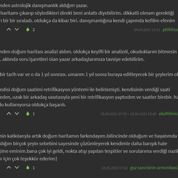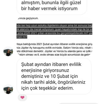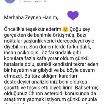 Karma ve Klasik Astroloji alanında Sevilay Eriçdem'den ve Oğuzhan Ceyhan ekolünden eğitim aldım ve ileri seviyeyi bitirdim. 3 senedir kapsamlı Astroloji danışmanlığı veriyorum. Analizde sabit yıldızları da inceliyorum. Element dengeleri ve varsa eksik elementinizi dengelemeniz için yapacağınız şeyler, kullanacağınız şifalı taşlar hakkında bilgilendiriyorum. Sizin için uygun olan partner özellikleri, kariyer, evlilik, para gibi en çok merak edilen konular; hayatınızda sizi ileriye götürecek gelişim fırsatları ve alanları hakkında ve sizi geriye çeken konfor alanlarınız hakkında bilgilendiriyorum ve bunlardan hariç birçok konuya detaylı olarak değiniyorum. Analizleri pdf formatında hazırlıyorum. Yaklaşık 6-7 sayfa sürüyor ve her cümlesi bana ait oluyor. Sonrasında ve/veya öncesinde sorular sorabiliyorsunuz. Analiz için doğum yeri, doğum saati, doğum tarihi, cinsiyet, medeni hal ve mail adresi bilgileriniz gerekiyor. Armut uygulamasında yeni bulunduğum için danışmanlıklarımı oldukça uygun fiyatlarla veriyorum. Fotoğraflar kısmından verdiğim danışmanlıklarımdan aldığım geri dönüşlere göz atabilirsiniz. Ekşi Sözlük'te nickiyle yazıyorum. Siyah arka planlı geri dönüşler Ekşi Sözlük'teki danışanlarımın nick altıma yazdığı geri dönüşlerdir. Verdiğim Hizmetler: ● Kapsamlı Doğum Haritası Analizi: Doğum haritasındaki tüm göstergelerin ve sabit yıldızların kapsamlı bir şekilde incelenmesi. 7 sayfa süren detaylı bir analizdir. (150 tl) ● 3/6/9/12 Aylık Ön görü Analizi: Doğum haritanız ile transit haritanın üst üste konulup gelecek olaylar hakkında tahminler yürütülmesi.(100, 150, 200, 250 tl) ● Soru Astrolojisi(horary) Analizi: Sizin için çok önemli olan tek bir sorunun cevaplanması.(70 tl) ● Sinastri(İlişki) Analizi: İlişkinizin güçlü ve zayıf yanları, ruh eşi ve ruh ikizi konuları, karşılıklı olarak birbirinizi nasıl etkilediğiniz, dikkat etmeniz gerekenler ve ilişkinizin geleceğe dair tüm potansiyellerinin incelenmesi.(100 tl) Sevgilerimle.