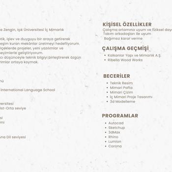 Ücretsiz ön görüşme ve konsept fikir paylaşımı yapıyorum Merhaba, ben Zeynep Sude Zengin. Işık Üniversitesi İç Mimarlık mezunuyum. Tasarım yaklaşımım; estetik, işlev ve kullanıcı deneyimini bir araya getiren mekânlar üretmek üzerine kurulu. Konut, butik otel, ofis ve ticari alan projelerinde konsept tasarım, iç mimari proje geliştirme, 3D modelleme ve teknik çizim hizmetleri sunuyorum. Her projede mekânın karakterini ve kullanıcı ihtiyaçlarını analiz ederek özgün tasarım çözümleri geliştiriyorum. AutoCAD, SketchUp, 3ds Max, Rhino, Lumion ve Corona programlarını aktif olarak kullanarak projeleri hem teknik hem de görsel olarak detaylı şekilde sunuyorum
