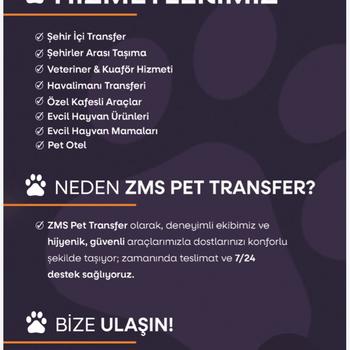 ZMS Pet Transfer: Sadece Taşımaz, Değer Veririz! Can dostlarınızın seyahati artık bir stres kaynağı değil, konforlu bir yolculuğa dönüşüyor. ZMS Grup Veterinerlik Ltd. Şti. bünyesinde, tamamen yasal ve profesyonel standartlarda hizmet veriyoruz. Neden bizi tercih etmelisiniz? • Kurumsal ve Yasal Güvence: "Gizli saklımız yok." Tüm belgeleri tam, veterinerlik grup şirketi güvencesiyle faturalı ve yasal hizmet sunuyoruz. • VIP Donanımlı Araçlar: Özel kaplamalı, profesyonel kafes sistemli ve ısı kontrollü Toyota Proace City araçlarımızla konforu en üst seviyede tutuyoruz. • Maksimum Hijyen: Her transfer öncesi ve sonrası araçlarımızı Virkon S ile sterilize ederek biyolojik güvenliği sağlıyoruz. • Şeffaf Süreç: Yolculuk boyunca anlık konum, fotoğraf ve video paylaşımıyla dostunuzun her anını takip edebiliyorsunuz. • Geniş Hizmet Yelpazesi: Sadece transfer değil; Pet Otel, Köpek Eğitimi, Pet Kuaför ve profesyonel gezdirme hizmetlerimizle bir dostun ihtiyacı olan her noktadayız. •Egzotik Canlı Uzmanlığı: Sadece kedi-köpek değil, egzotik hayvan taşımacılığında da profesyonel ekipman ve bilgiye sahibiz. ZMS Grup olarak biz, can dostlarınızı kendi evladımız gibi taşıyor, profesyonelliği şefkatle birleştiriyoruz. 7/24 yanınızdayız!