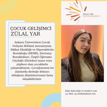 Merhabalar ben çocuk gelişimci Zülal. DEHB ve Öğrenme Güçlüğü tanısı veya şüphesi olan çocuklarla çalışmaktayım. Ayrıca çocuğunuza özel gelişimsel değerlendirme ve gelişim takibi için de ulaşabilirsiniz…