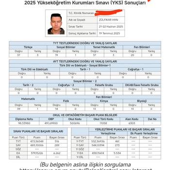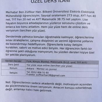 Merhaba ben Zülfikar Han. 2025 YKS sınavında sayısal alanda 273. oldum. Bilkent Üniversitesi Elektrik Elektronik Mühendisliği bölümüne burslu olarak yerleştim. Lise hayatım boyunca arkadaşlarımın yüzlerce sorusunu çözdüm ve arkadaşlarıma onlarca kez konu anlattım.Bu konularda kendimi yetkin görüyorum. AYT de Fenim 40 TYT de ise 20 ydi AYT de Matematiğim ise 38.75 ti. Size faydalı olabileceğime inanıyorum.